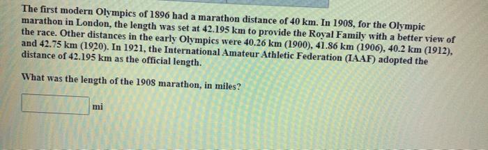 Running The Numbers The 1908 London Olympic Marathon from 64.media.tumblr.com The distance from the windsor castle to the olympic stadium was 42. The 1908 olympic games were originally awarded to rome, but were reassigned to london when it became apparent that rome would not be ready. To commemorate his impressive run, when the modern marathon was introduced at the first modern olympic games, which were held in athens in 1896, the distance for the olympic marathon was set at 25 miles. When olympic marathon races first appeared in the 1896 athens games, the route was a somewhat arbitrarily chosen 25 miles and, contrary to popular myth, had no authentic origin in greek history. On 24 july 1908, the final day of athletics at the olympics, 100,000 people crammed into the stadium at white city in london to witness the conclusion to the marathon, with estimates putting the number locked outside at up to a million. The italian was subsequently disqualified and the title given to john hayes of the u.s. The marathon was the most glamourous and enthralling event of the early modern olympics since it was introduced in athens 1896, inspiring the inaugural. The 1908 olympics were to take place in rome, but a volcanic eruption of vesuvius in 1906, that severely affected naples, made the italian therefore london took the chance of organizing the olympics, building for that purpose a big stadium in white city.